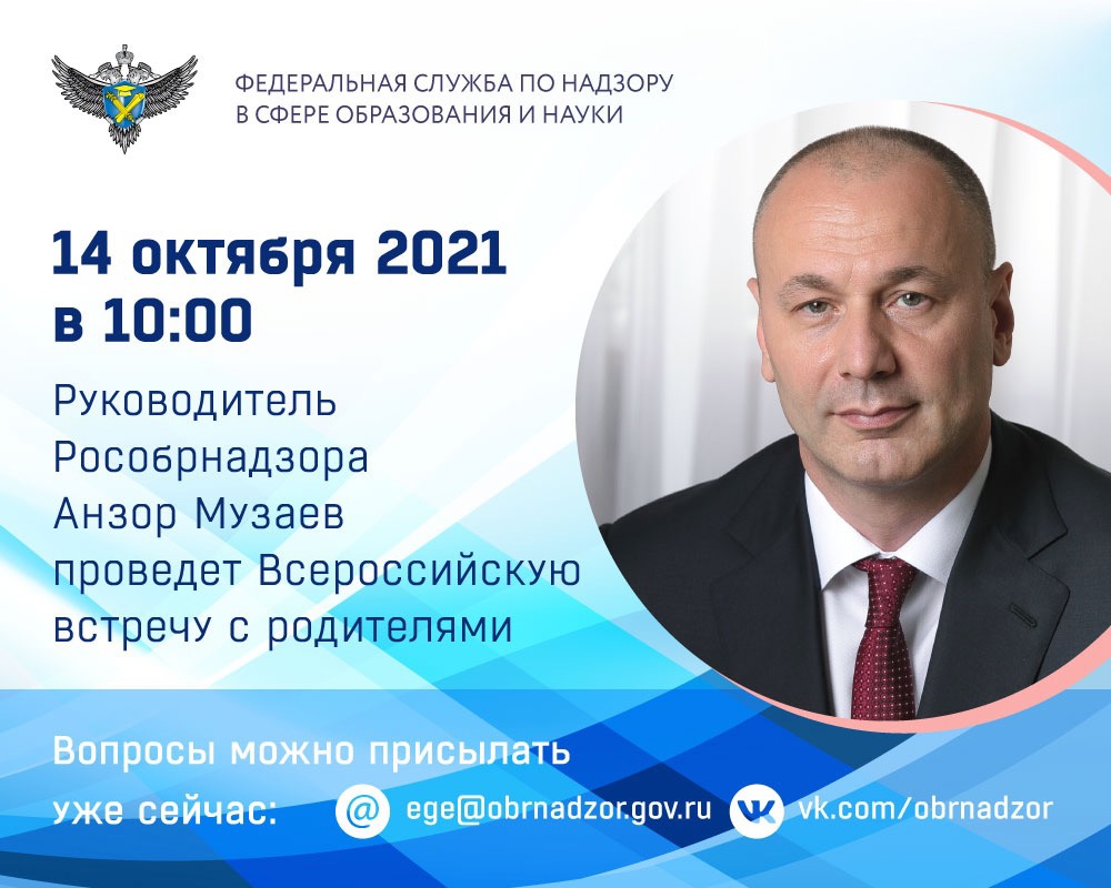 Вопросы можно направлять в письменной форме или в формате видеообращения. Ответы на наиболее популярные и интересные из них будут даны в ходе встречи. Увидеть встречу в прямом эфире можно будет в сообществах Рособрнадзора «ВКонтакте» и на YouTube.
